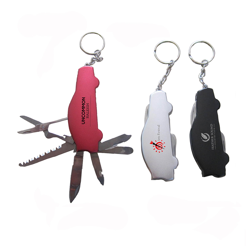 Multi-functional tool w/ key ring comes with a knife, scissors, bottle opener, wood saw, bag needle, nail file, key chain. Very high quality, modern, durable, comfortable and inexpensive. It's convenient to store and easy to clean up. Allow this useful tool to get you the attention you deserve! It is a perfect giveaway gift for company promotion. Custome Logo is available.